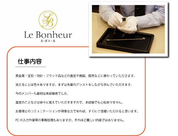 | 募集職種・職務内容 | 貴金属やブランド品などのバイヤー、及び接客のお仕事です。ブランド品や時計が好きな方、接客・販売の経験をお持ちの方や、人と話すことが好きな方にピッタリのお仕事です。最初はベテランスタッフが中心となって査定しますので、自分でもできるかしら?という不安を感じる心配はありません。 |